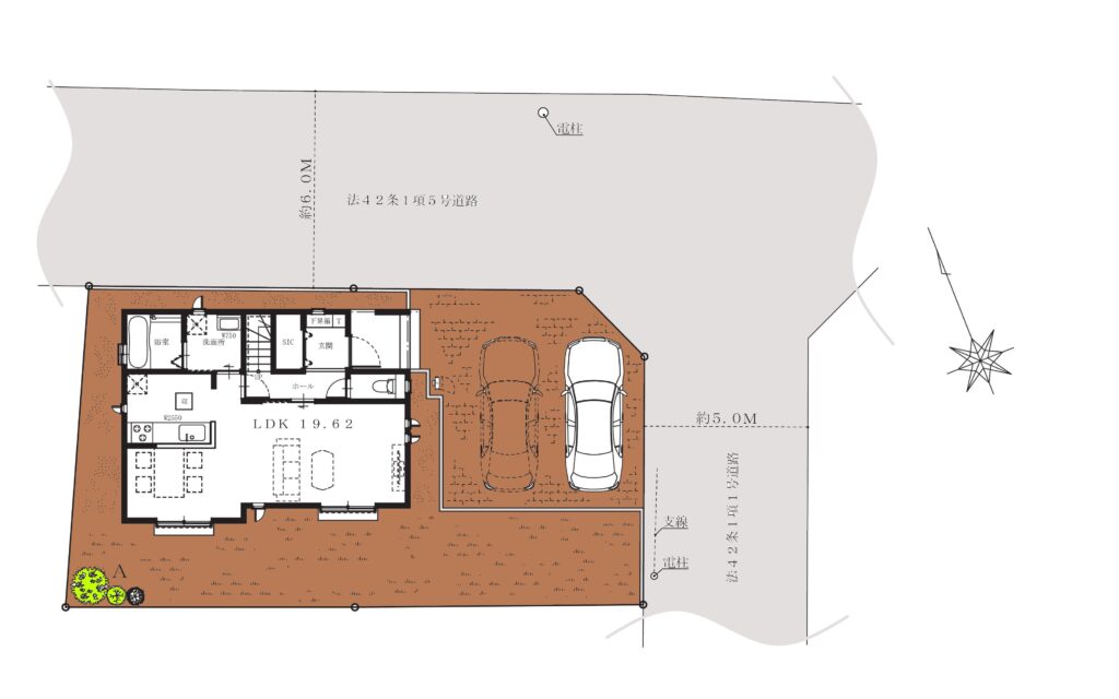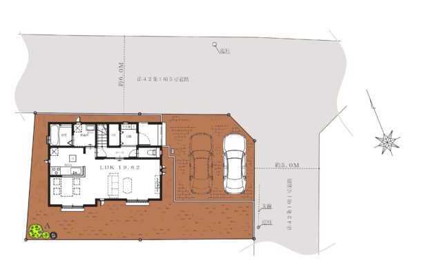 前面道路約5m、駐車2台可のゆとりある区画