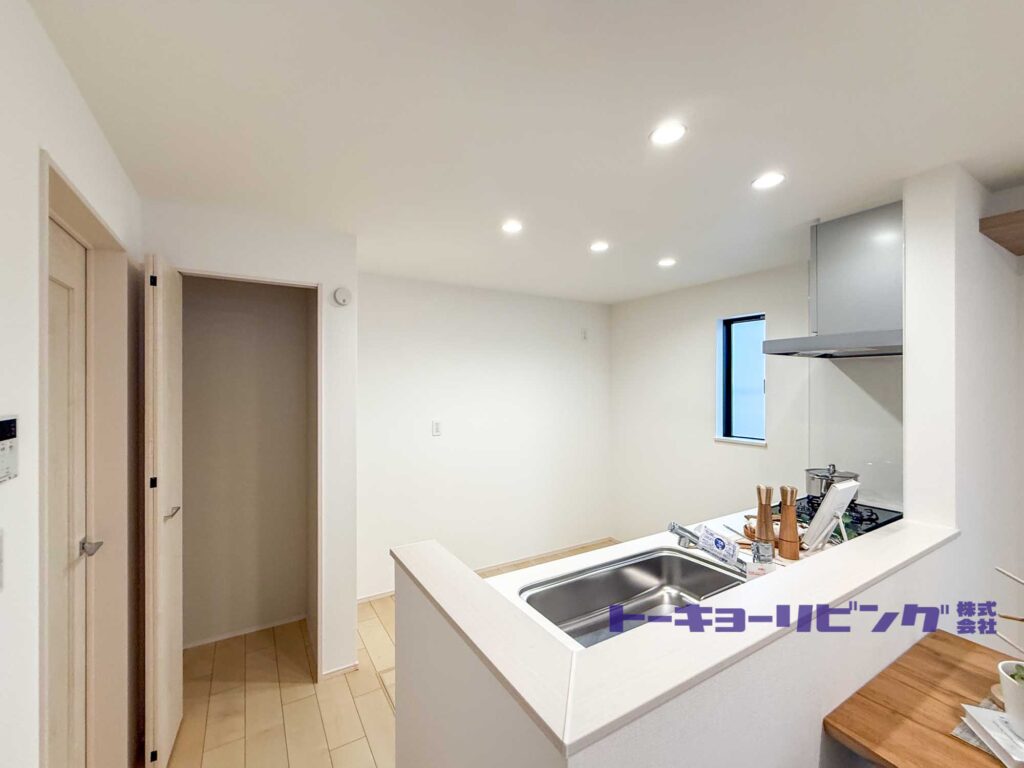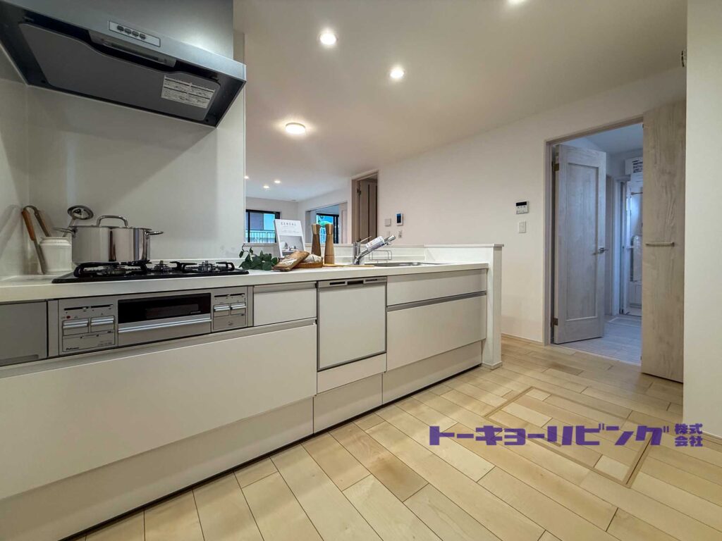白で統一された美しいキッチン。リビングの隅々まで見渡すことができ、日々の慌ただしさをすっと静めてくれます。