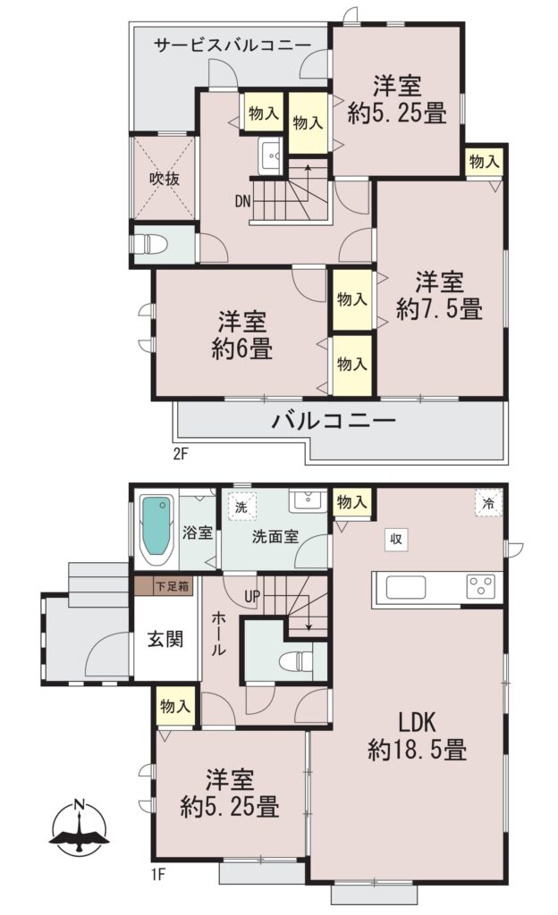 | 間取り | 4LDK(LDK約18.5帖、洋室約7.5帖・約6帖・約5.25帖×2) |