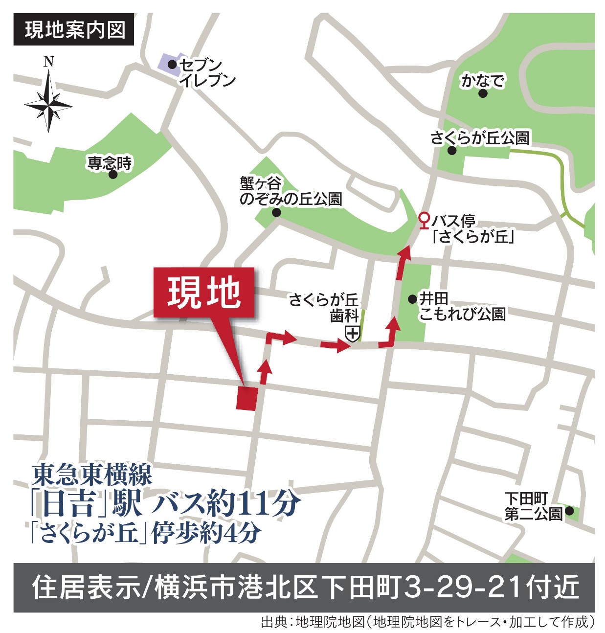 東急東横線「日吉」駅バス約11分、「さくらが丘」停歩約4分。